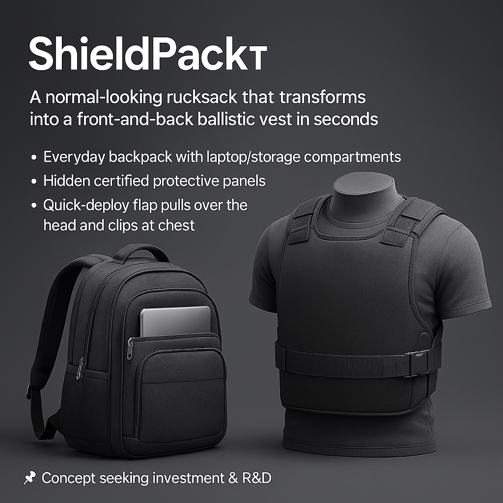Everyday pack that unfolds into front-and-back ballistic protection.