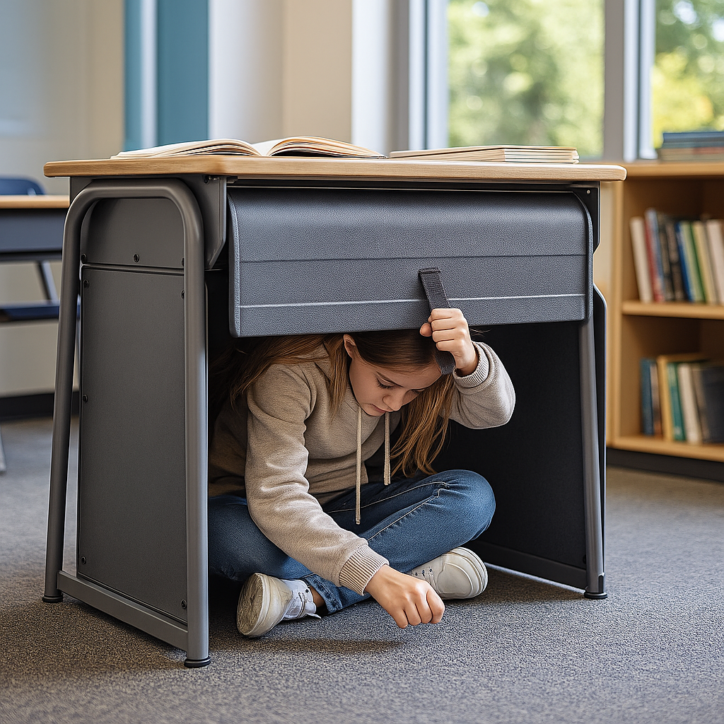 Child-size emergency workstation that converts into a ballistic shield during active-shooter events.