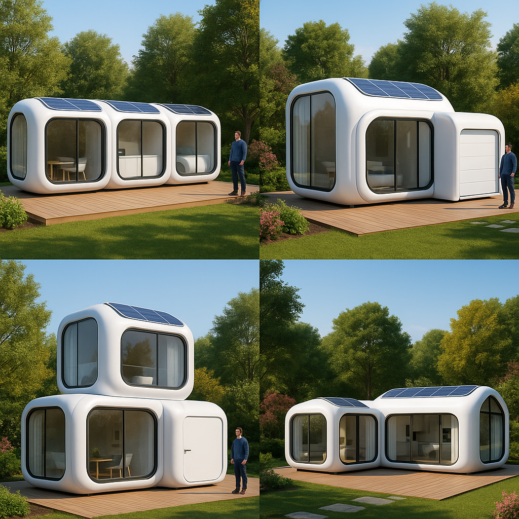 Clip-together pod-home system; expand rooms, kitchens, or garages like Lego.