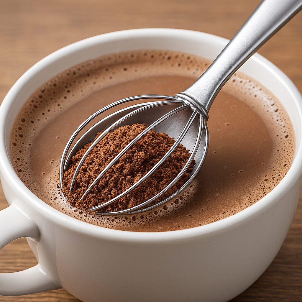 Hot-chocolate spoon-whisk preventing dry powder from settling.