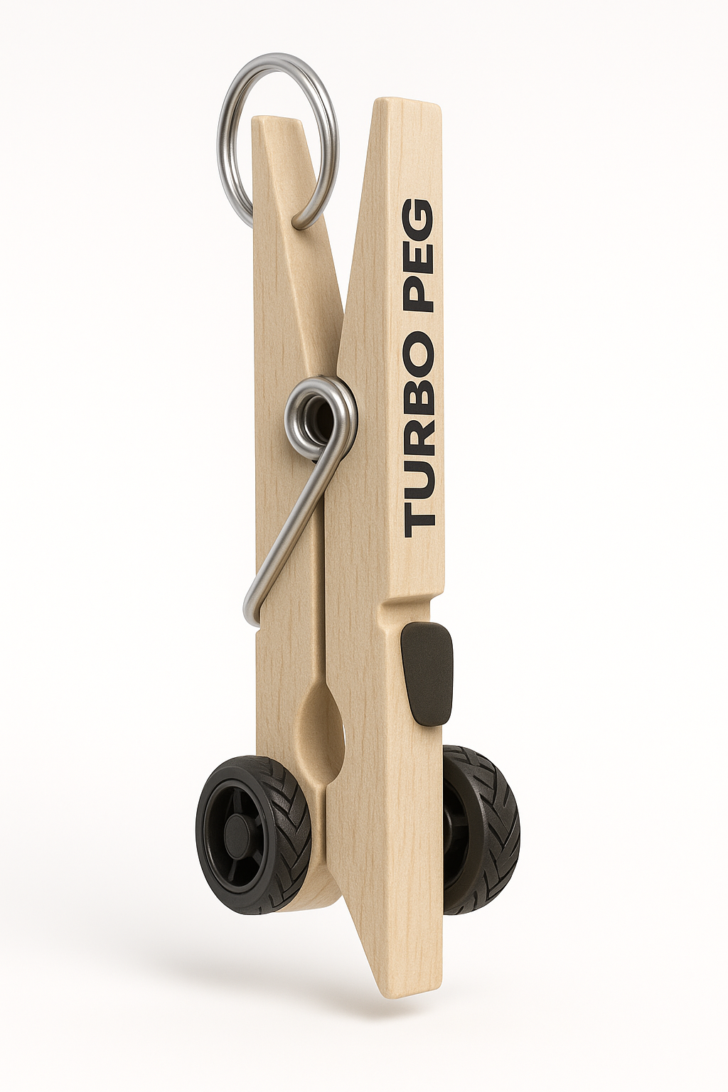 Wheeled laundry peg that slides all washing to one end so it can be removed in a single motion — no unclipping.